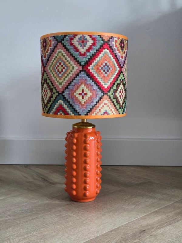 Deze prachtige lamp is gemaakt van een nieuwe oranje bubble vaas. De voet heeft een hoogte van 18cm (excl. fitting) en is afgewerkt met een messing getrapte afdekkap, goudkleurige fitting en een snoer met schakelaar.