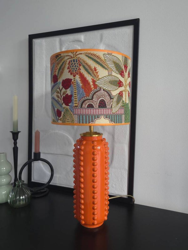 Deze lampenkap met oosterse print, is voorzien van een oranje kleur bies, goudkleurig frame en een mat gouden binnenkant. De print kan per lampenkap verschillen.