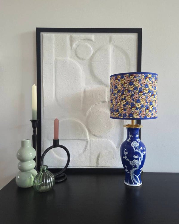 Deze mooie lamp is gemaakt van een Chinese vaas is mooi diep blauw van kleur met een bloesem print. De voet heeft een hoogte van 26cm (excl. fitting) en is afgewerkt met een messing getrapte afdekkap, goudkleurige fitting en een snoer met schakelaar.