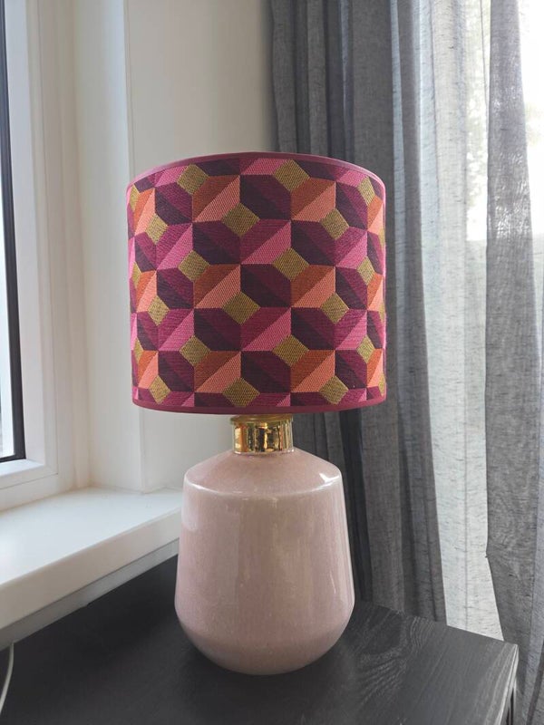 Deze prachtige lampenkap is gemaakt van een geometrisch stof in warme retrokleuren en frisse accenten. De kap is afgewerkt met een bordeauxrode bies, een goudkleurig frame en een mat gouden binnenkant.