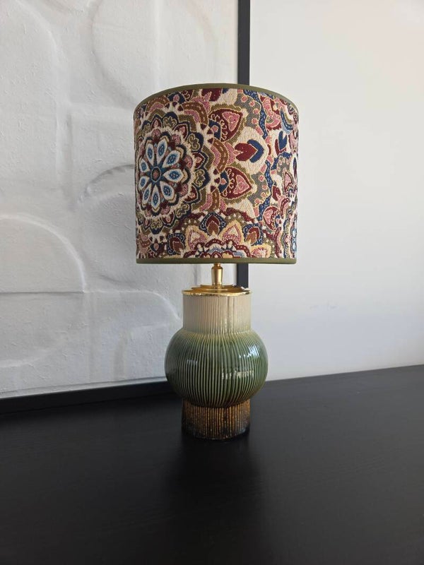 Deze mooie lampenvoet is gemaakt van een nieuwe vaas in natuurlijke groentinten met accenten van beige en bruin. De hoogte is 18cm (excl. fitting) en is afgewerkt met een messing afdekkap, messing E27 fitting en een snoer met schakelaar.