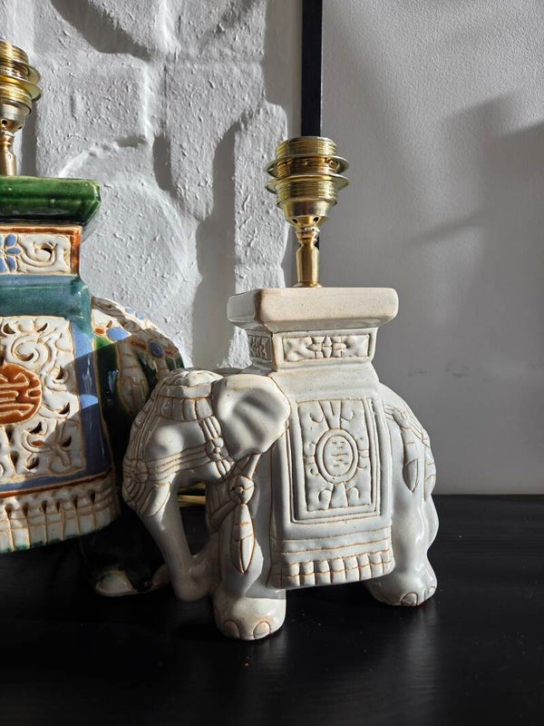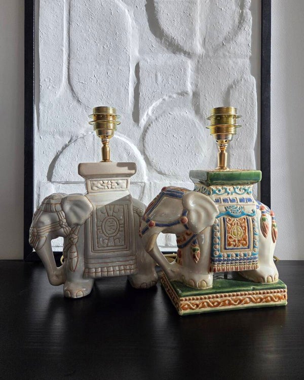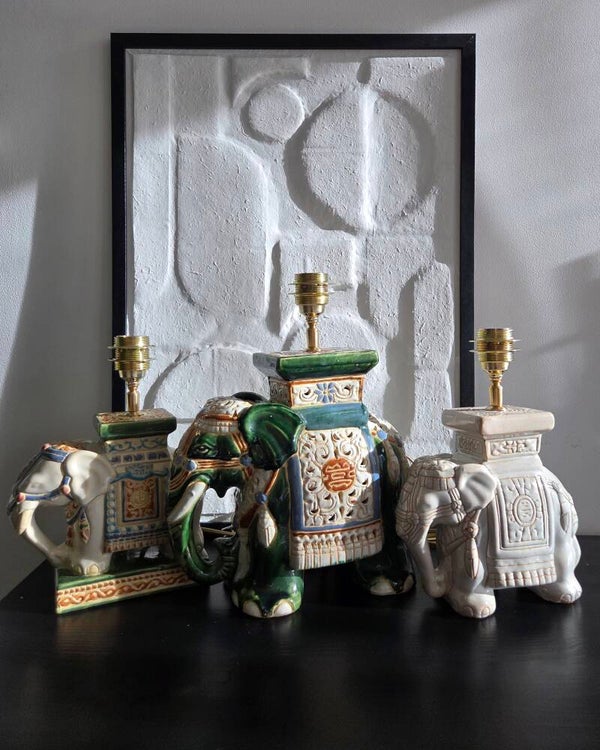 Deze prachtige lamp is gemaakt van een vintage olifanten plantenstandaard. De voet heeft een hoogte van ca. 21cm (tot aan fitting), is ca. 21cm breed en afgewerkt met een goudkleurige E27 fitting en een snoer met schakelaar