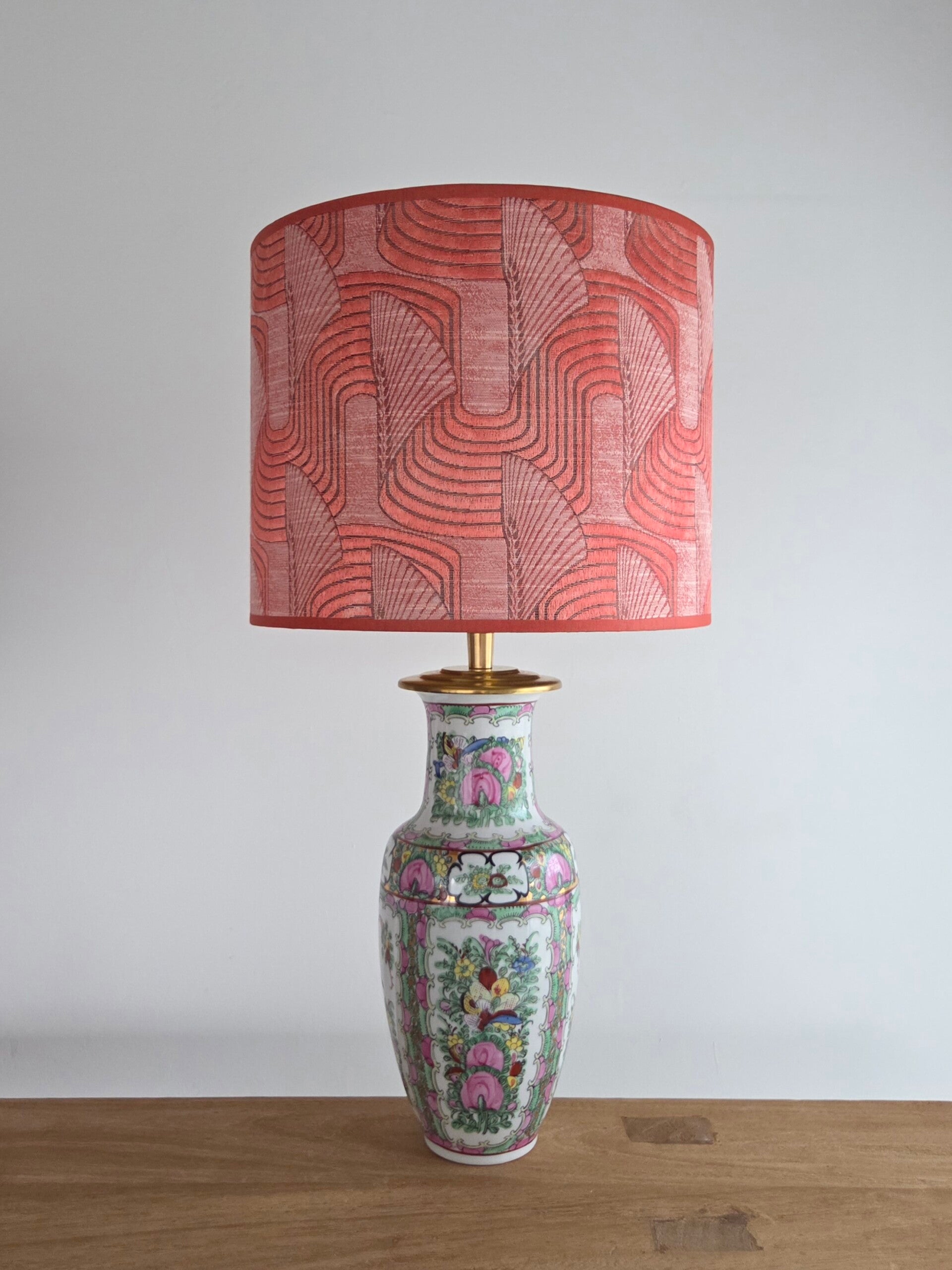 Deze prachtige lampenkap is gemaakt van een stof ontworpen door Karin Sajo, en heeft een warme koraal/framboos kleur.